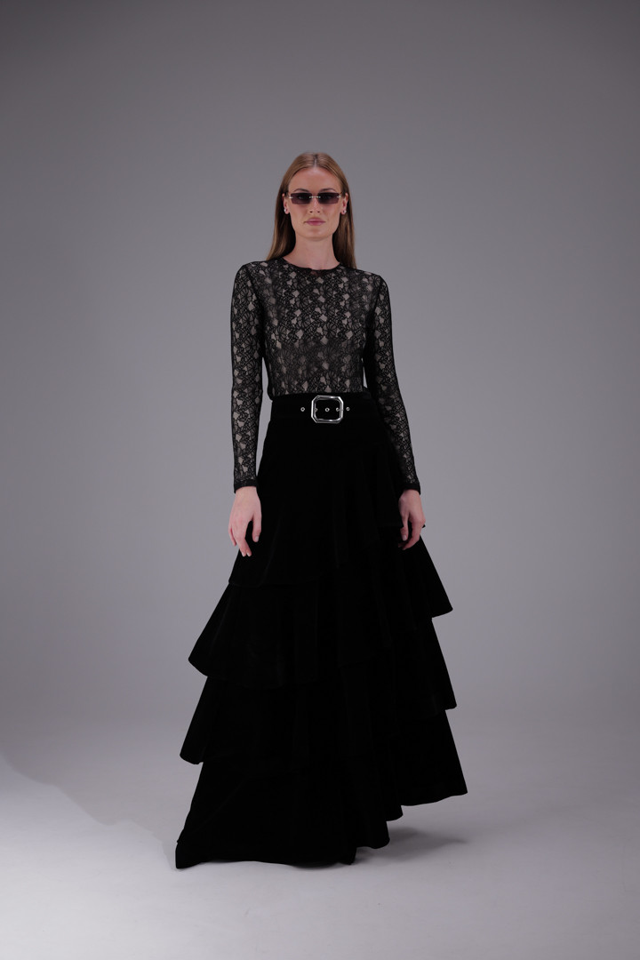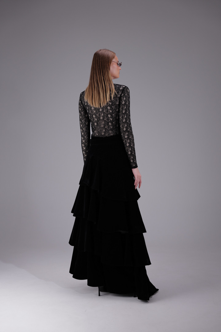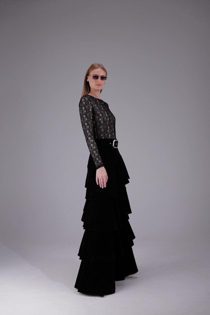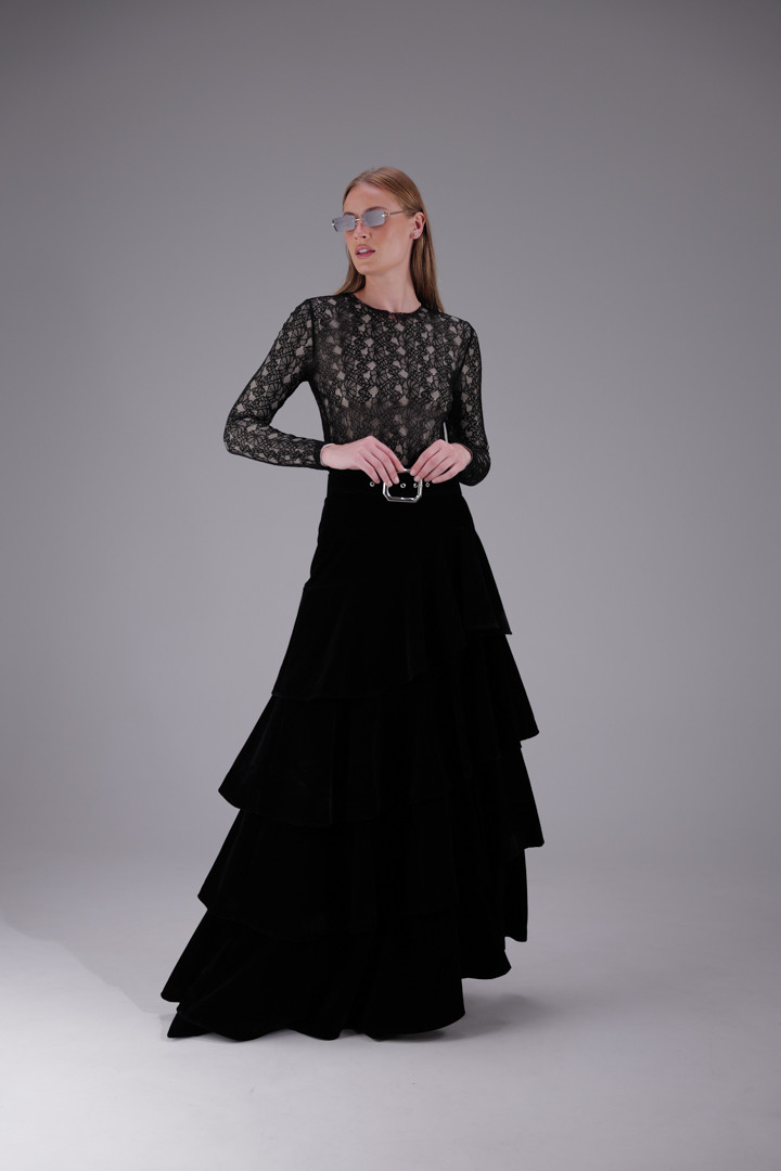 חצאית מקסי קומות קטיפה – חצאית עשירה ואלגנטית מבד קטיפה איכותי ורך שמעניק נוכחות מרשימה.