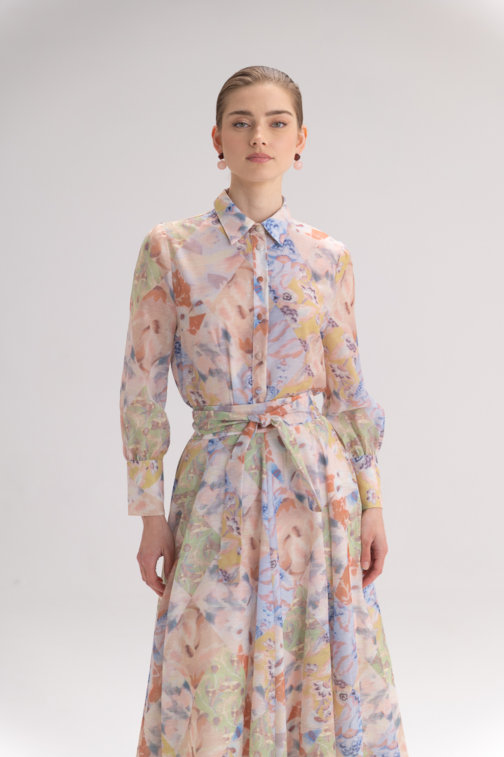 החצאית באורך מקסי זורם ומחמיא, עם חגורה תואמת מאותו הבד הנסגרת כשליף ומדגישה את קו המותן בצורה נשית וטבעית.