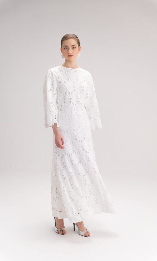 לשמלה פתח צוואר עגול ונקי שמעניק מראה עדין ועל־זמני. בקו המותן משתלבת חגורה שקופה עם אבזם מרהיב שמדגיש את הסילואטה ומוסיף נגיעה אופנתית עדכנית.