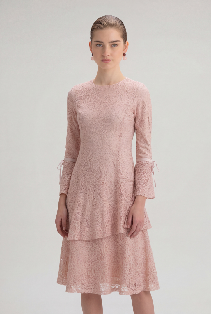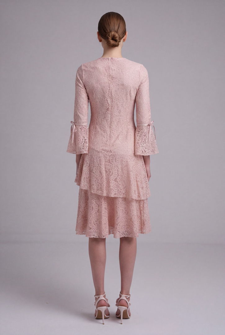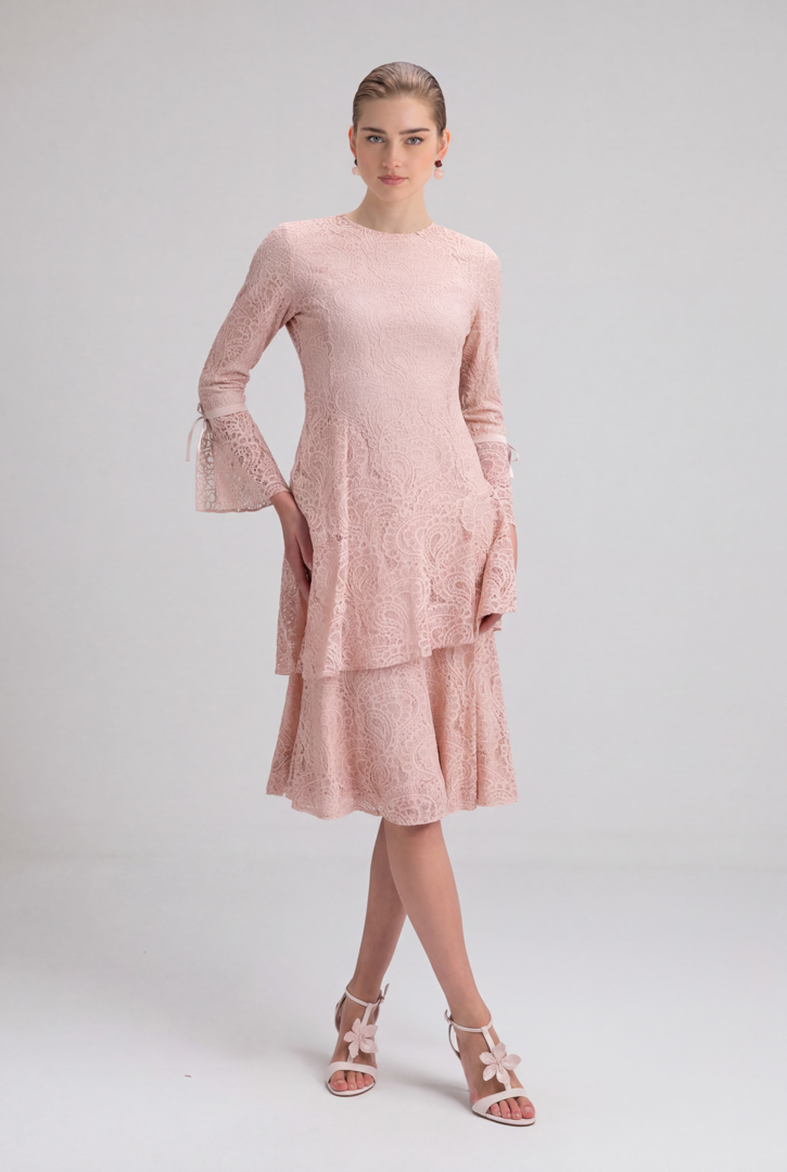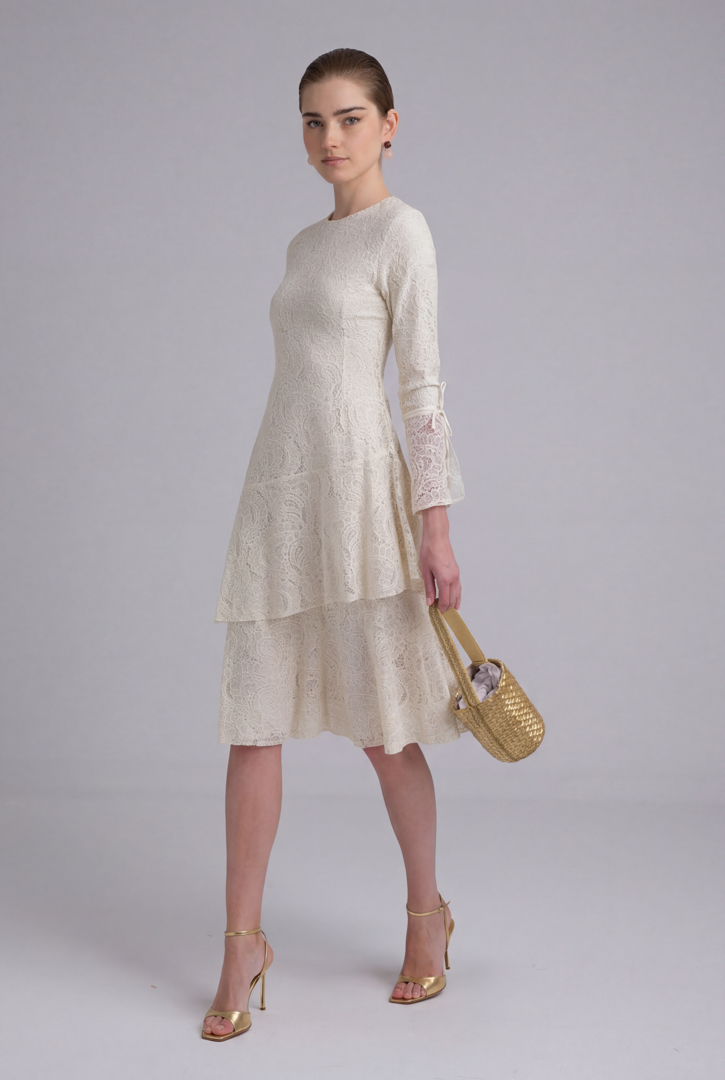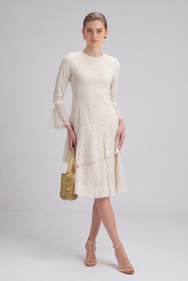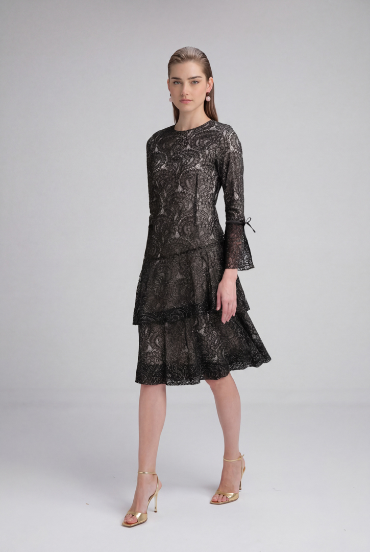 חלקה התחתון מעוצב בקומות מחמיאות, כשסיומת אלכסונית מעניקה לשמלה עומק ותנועה ייחודית.