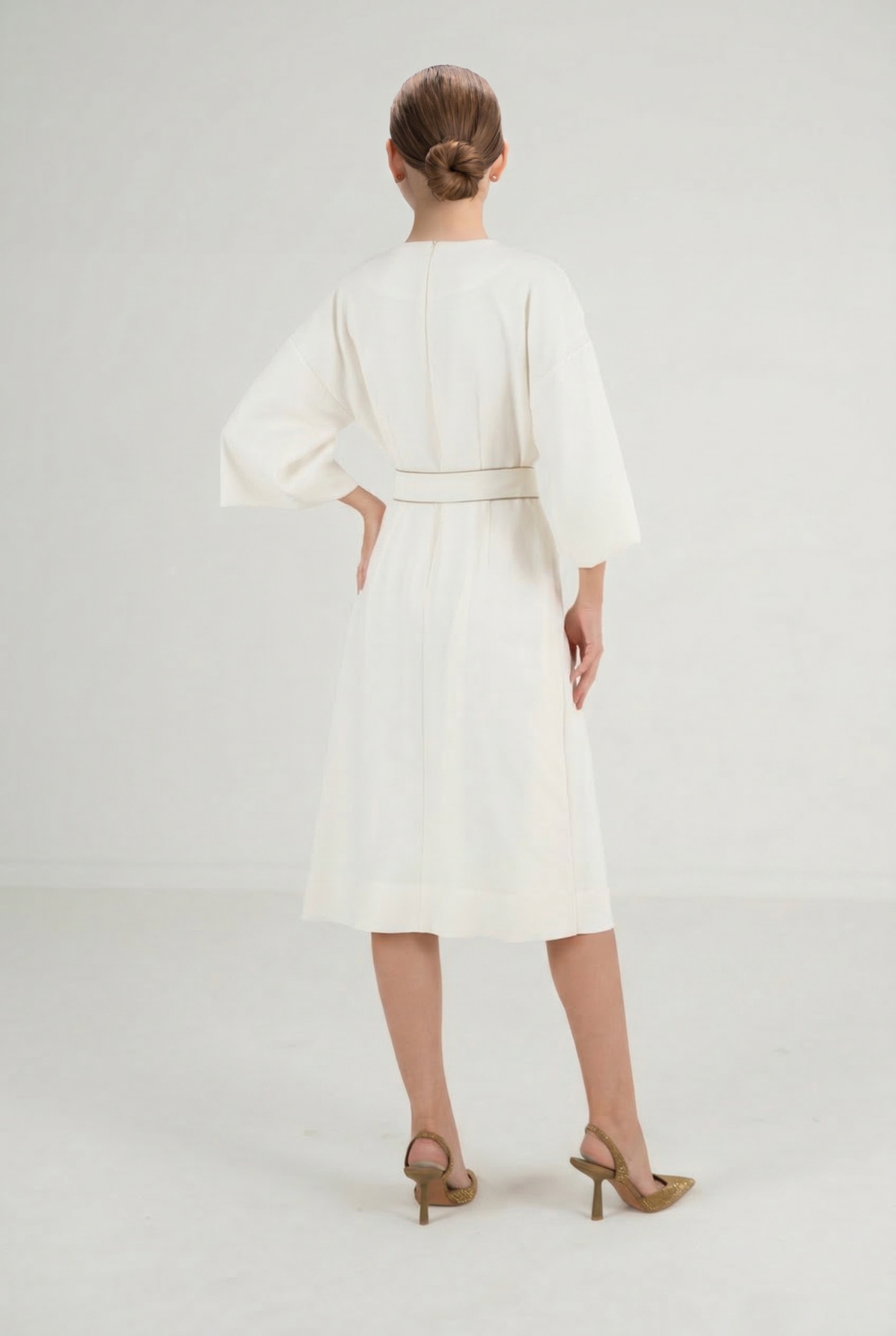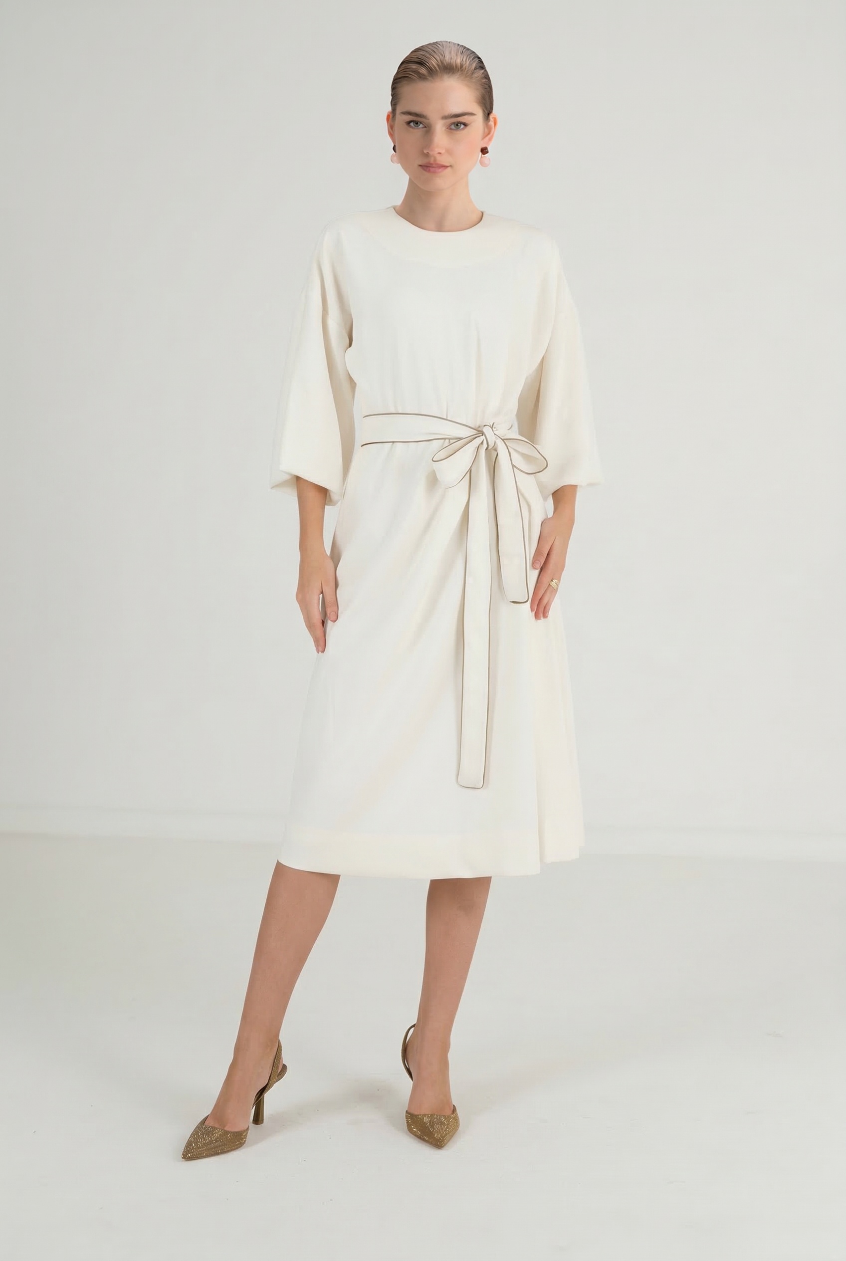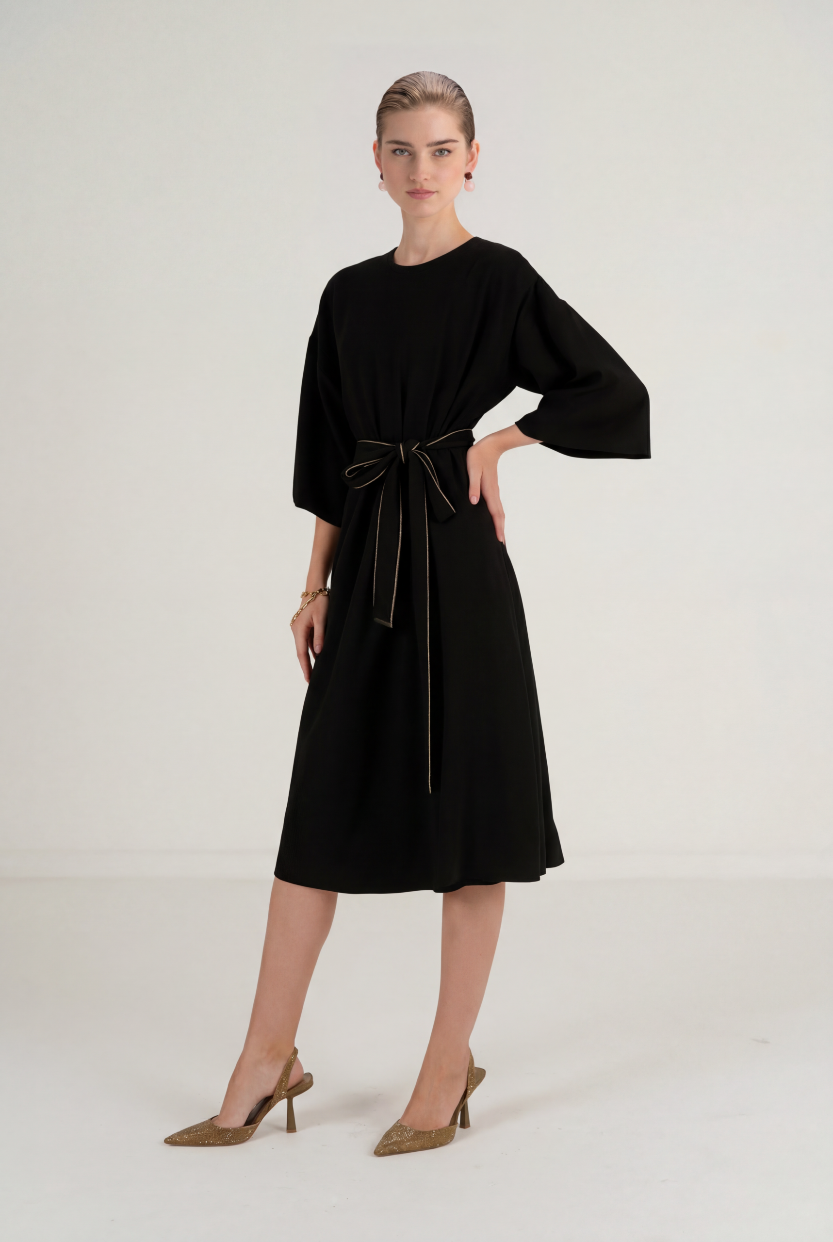 במותן – חגורה מבד תואם עם סיומת פסקפר זהב שמוסיף טאץ' יוקרתי ומרומם.