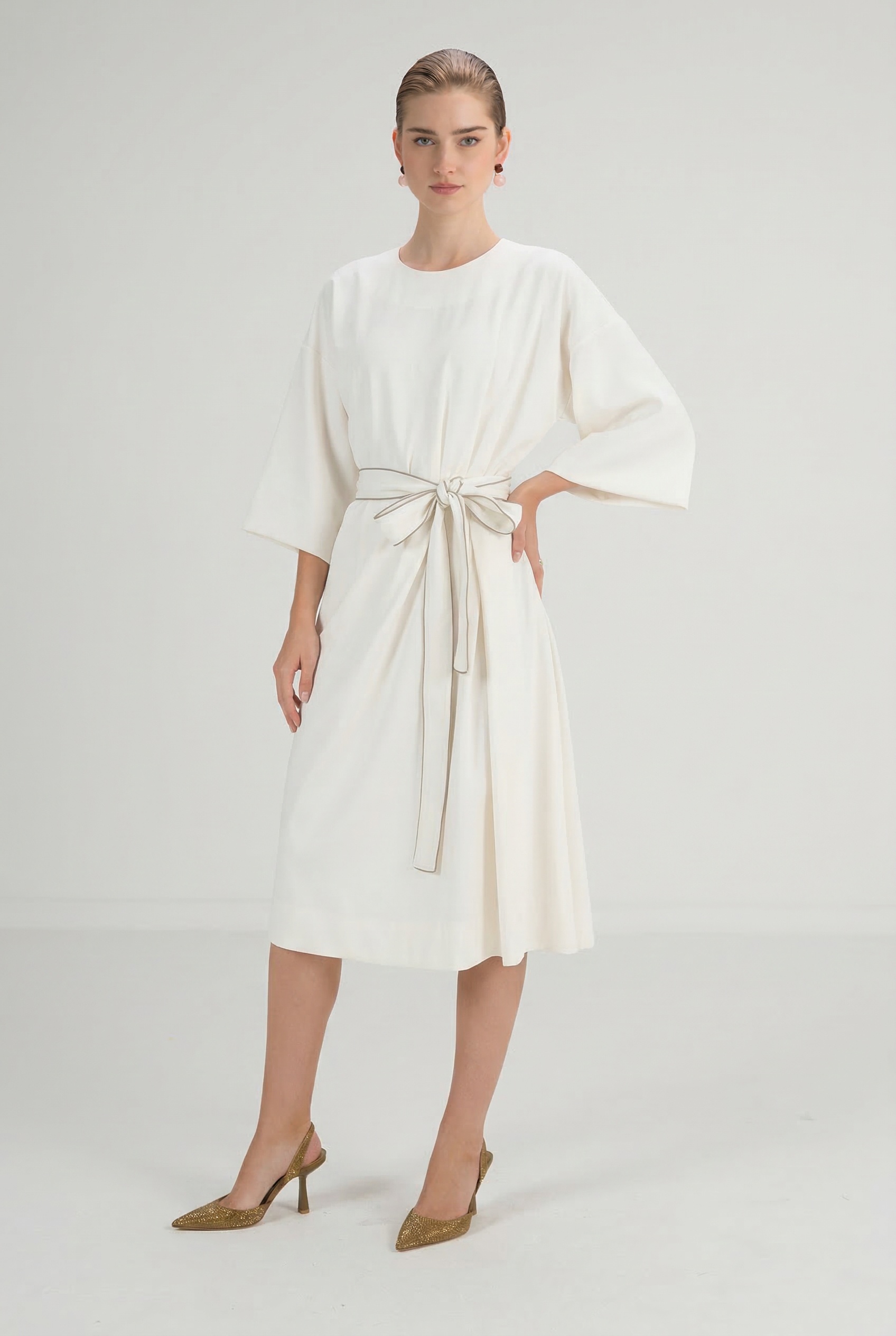 שמלה קלילה ונעימה בגזרת אוברסייז מחמיאה עם קו מותן מנימליסטי ורמז מדויק של שיק.