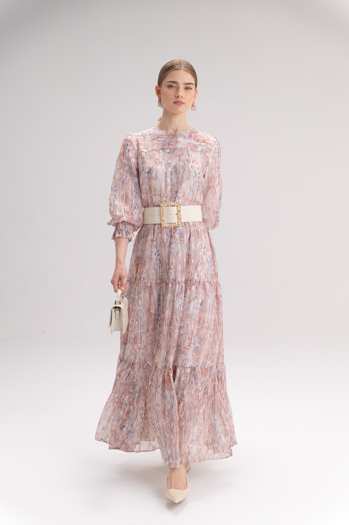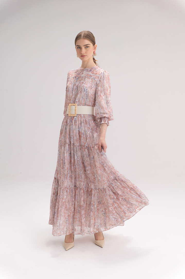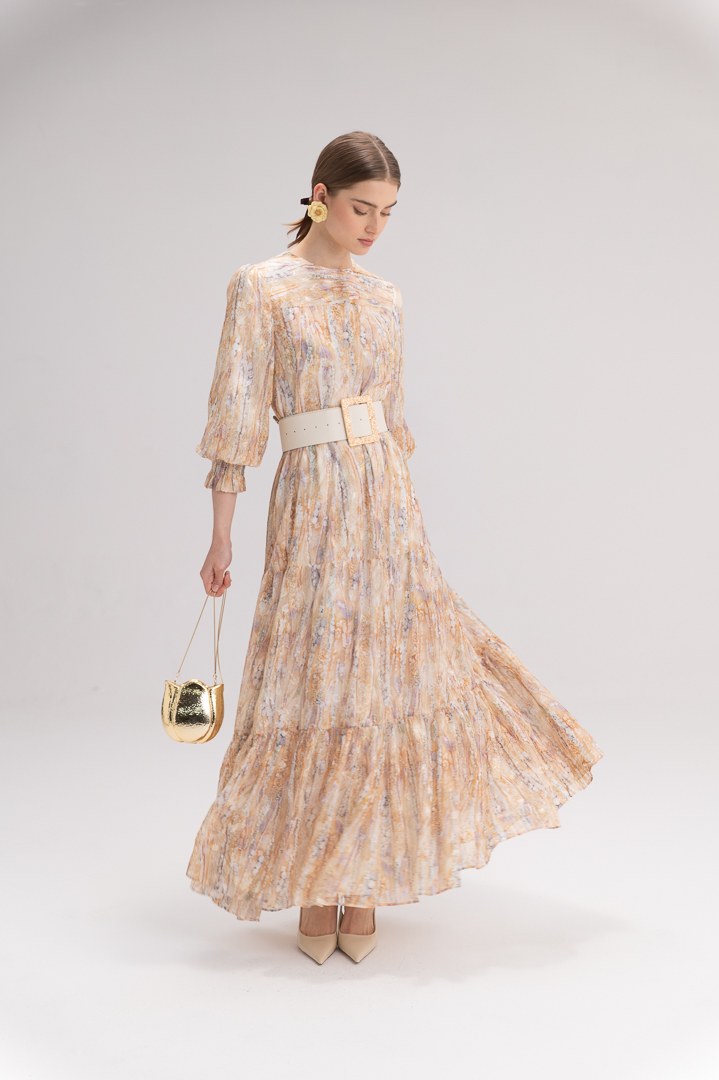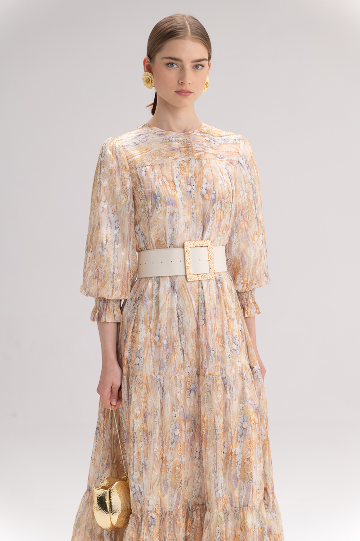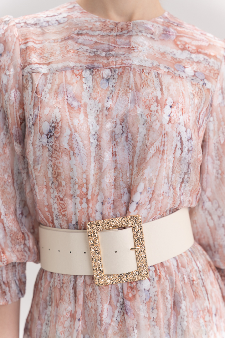 בקו המותן משתלבת חגורה עבה בצבע לבן עם אבזם זהב גדול ומרשים – פריט סטייטמנט שמדגיש את הסילואטה ומוסיף טאץ’ יוקרתי ובולט ללוק כולו. בחלקה התחתון גזרת קומות דמוית שכבות, היוצרת נפח עדין ומראה רומנטי.