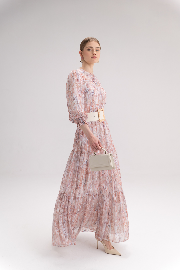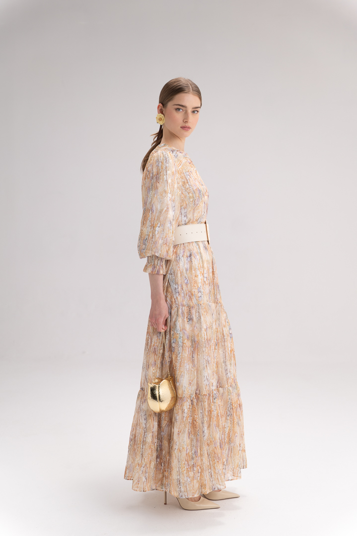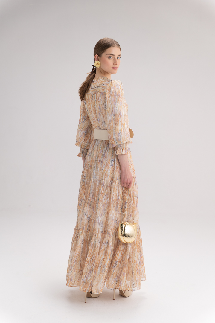 שמלת מקסי נקלס עשויה מבד שיפון אלגנטי בהדפסה יפהפייה, המעניק לה מראה עשיר, נשי ומלא נוכחות. הבד הקליל נשפך ברכות ויוצר תנועה טבעית וזורמת בכל צעד.
